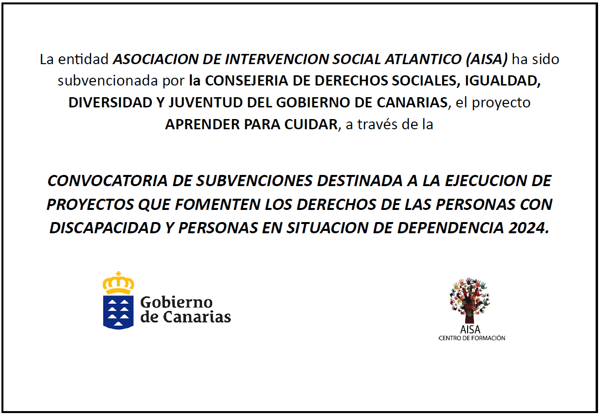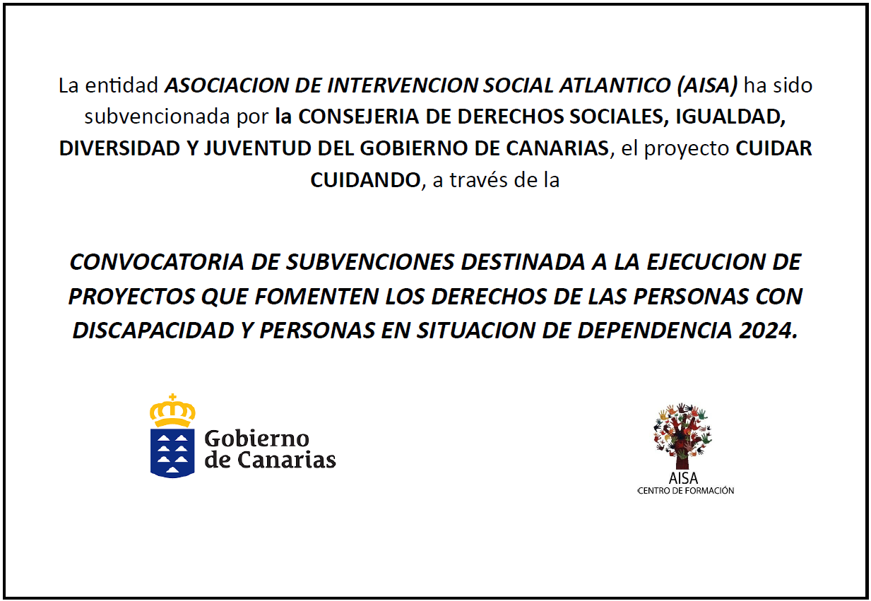 Subvencionado por el Gobierno de Canarias - Consejería de Derechos Sociales, Igualdad, Diversidad y Juventud. Ejecución de acciones para la Mejorar la calidad de vida de la persona cuidadora de personas en situación de dependencia o discapacidad a través de la formación