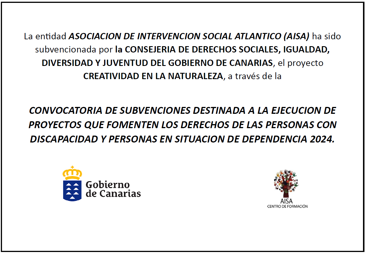 Subvencionado por el Gobierno de Canarias Subvención para la realización de un conjunto de actuaciones dirigidas al apoyo, desarrollo, la autonomía y madurez personal, mediante una intervención fundamentalmente educativa y relacional, cuya finalidad la prevención de acciones y el aprendizaje de habilidades pre laborales para su inserción y desarrollo laboral, dirigido a jóvenes